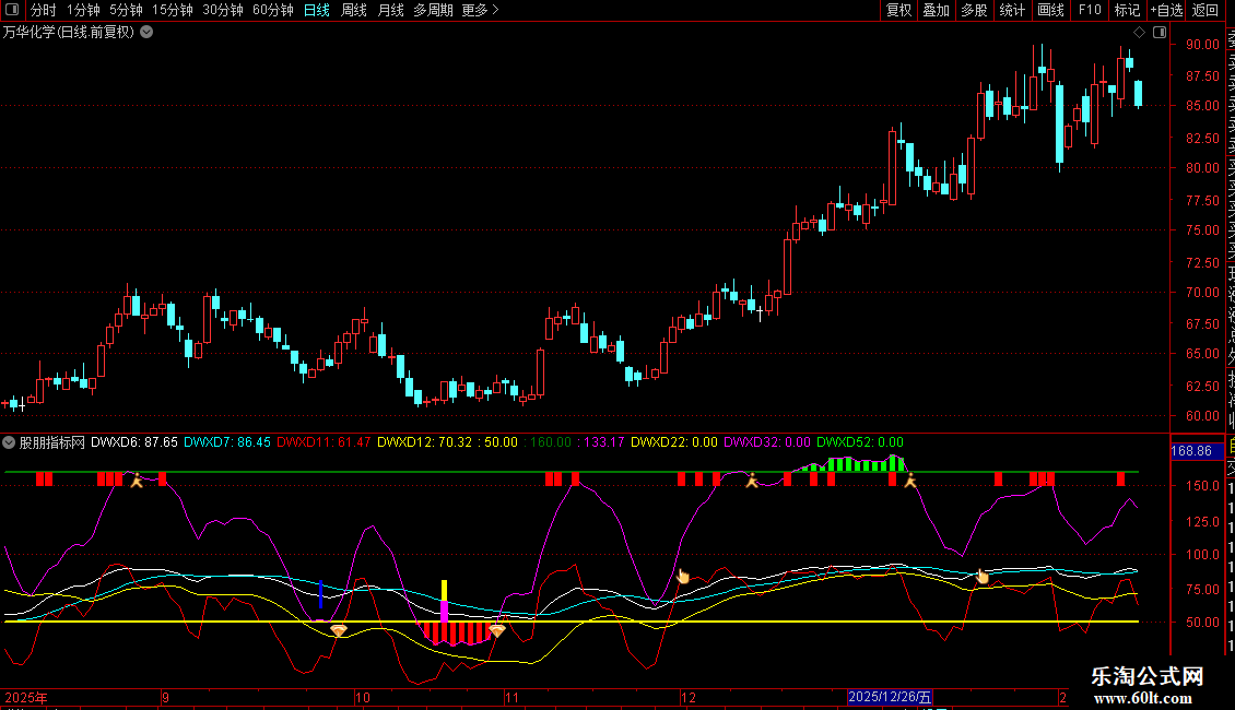 1. 区间判断:50(黄色粗线)为强弱分水岭,160(绿色粗线)为超买线。指标线(DWXD17,紫红色)上穿50出现红色图标,提示转强可逢低布局;下穿160出现绿色图标,提示超买回落,宜减仓。