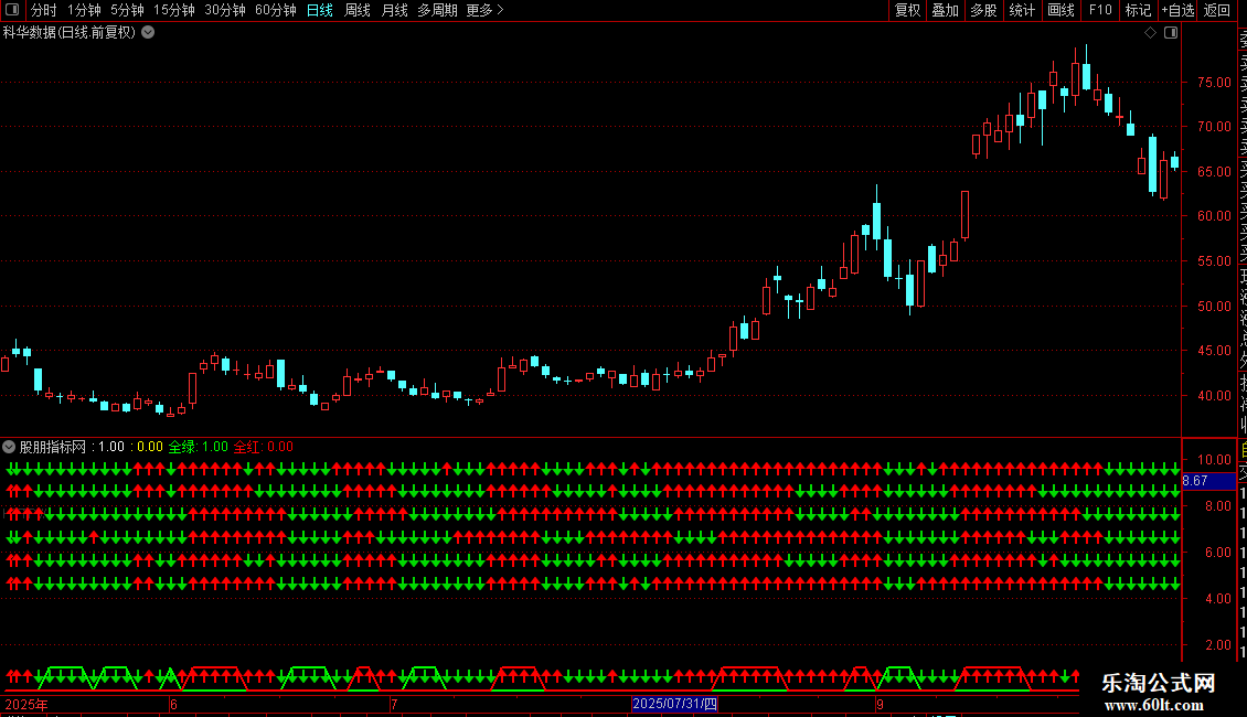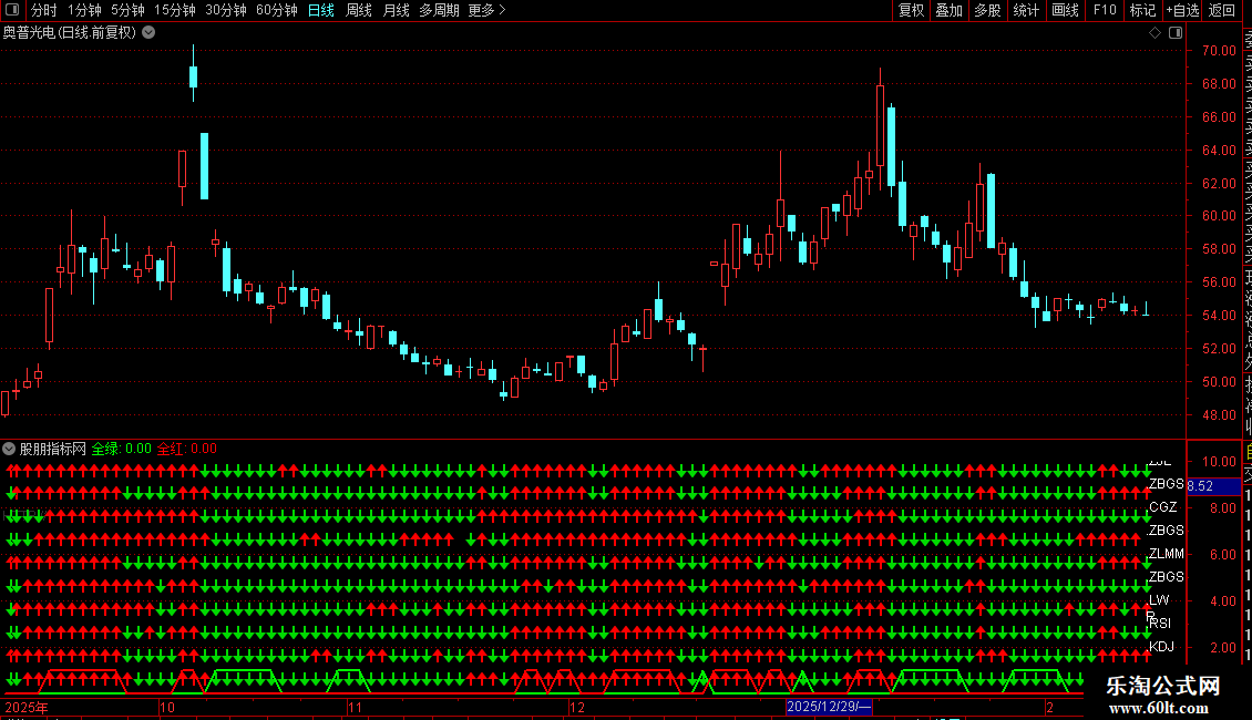 1、指标构成说明:该指标由十个独立的子指标共同组成,从上至下共显示十行,每一行对应一个经典技术分析指标。当某个子指标出现金叉信号时,对应行会显示红色向上箭头;若出现死叉,则显示绿色向下箭头,便于用户直观判断买卖时机。