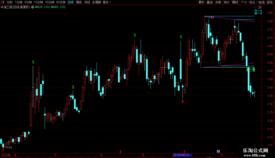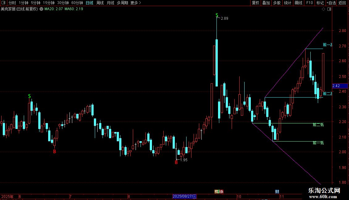 连接高低点的洋红色线条直观地显示了当前的支撑与压力区间。