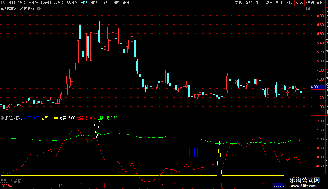 必买:使用TROUGHBARS函数寻找最近一个满足条件的波谷位置。若当前是波谷(结果为0)且最高价大于最低价加0.01,则输出1,否则输出-1。以黄色细线显示。
