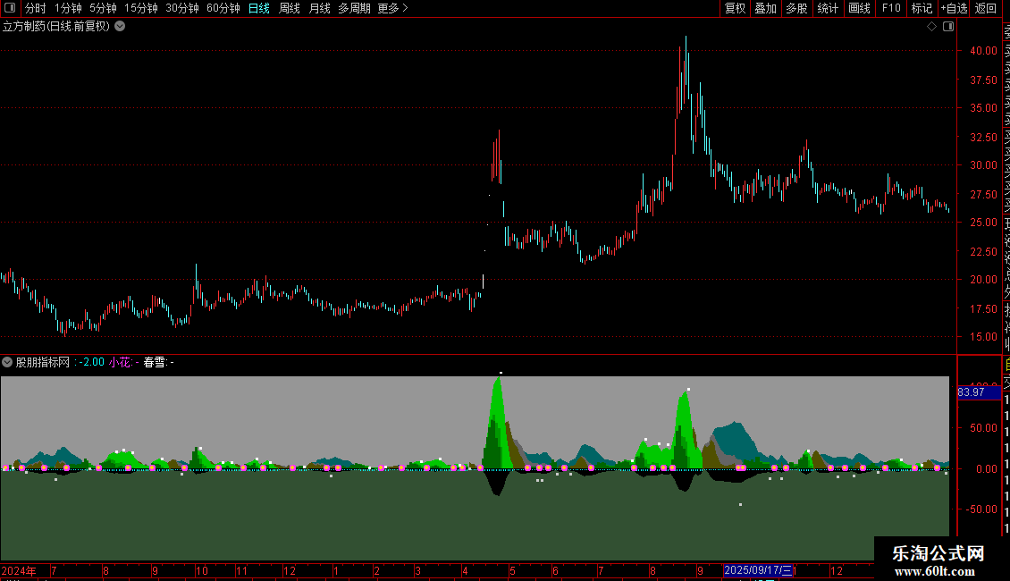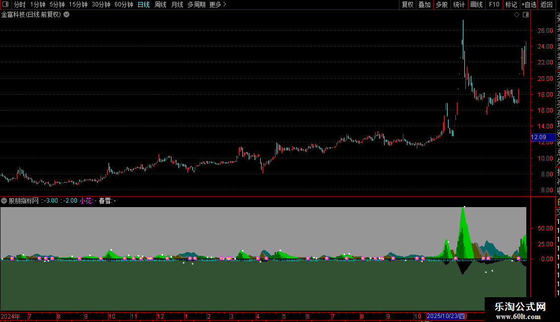 注意:指标信息高度密集,需结合价格走势综合判断。信号点(小花、春雪)仅为特定计算条件下的标记,并非直接的买卖指令。