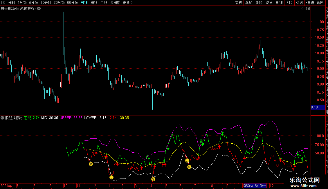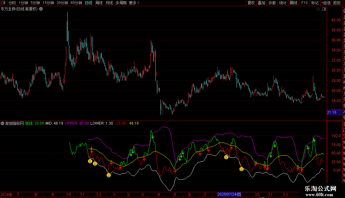 抄底信号:当“短线”指标自下而上穿越LOWER下轨线时,在下轨线下方约3%的位置(LOWER0.97)标记一个图标(通常为笑脸或钻石),提示超跌反弹机会。
