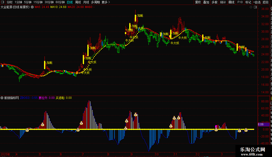 1. 主图看趋势与关键信号标注,副图验证资金动能,公式精准筛启动股;