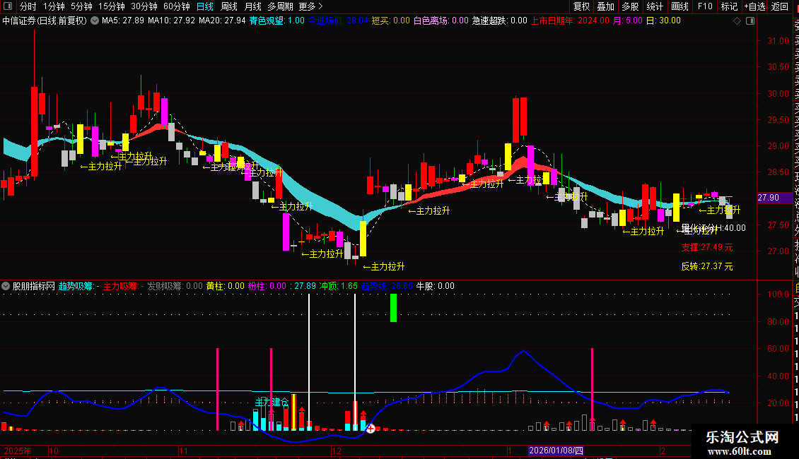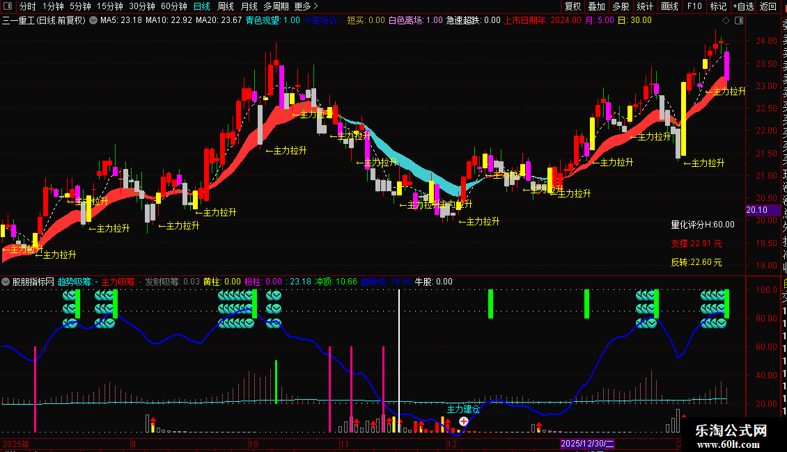 1. 主图:红色K线持股,灰色观望,出现“主力拉升”提示可逢低介入,白色离场信号需减仓;参考量化评分(≥60分偏强势)和支撑/阻力位设置止盈止损。