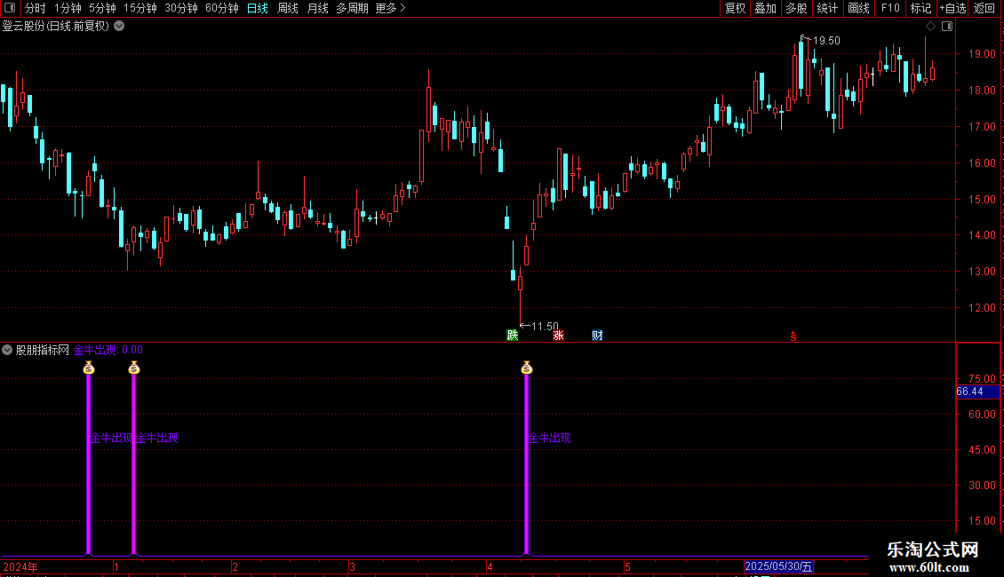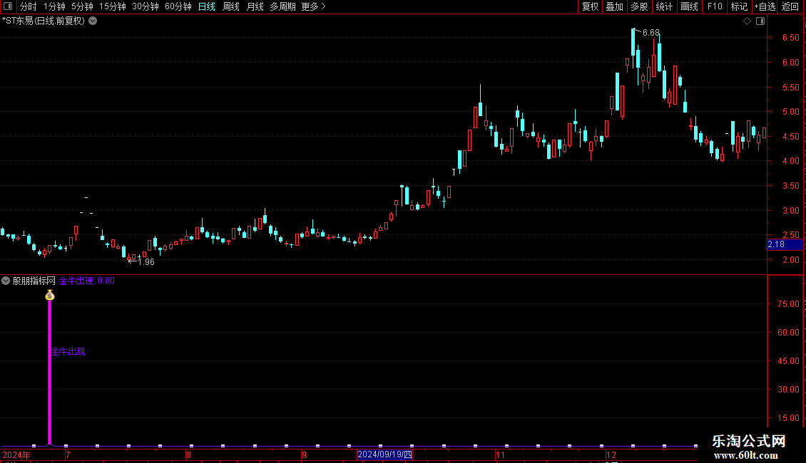 当“金牛出现”信号触发时,在副图或主图K线图上: