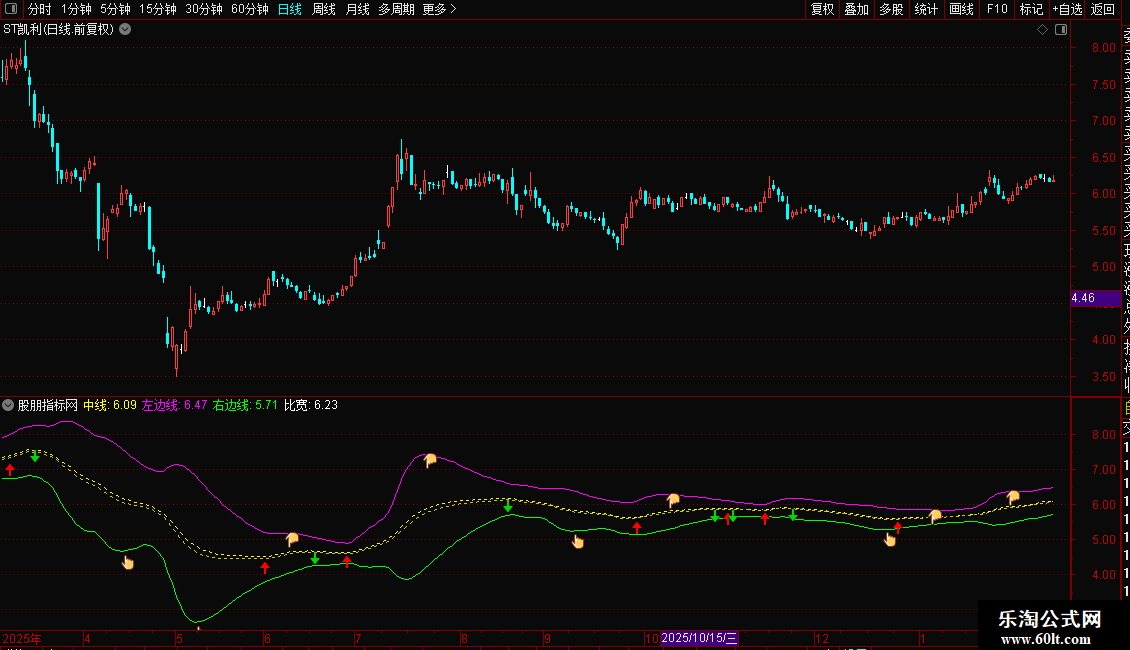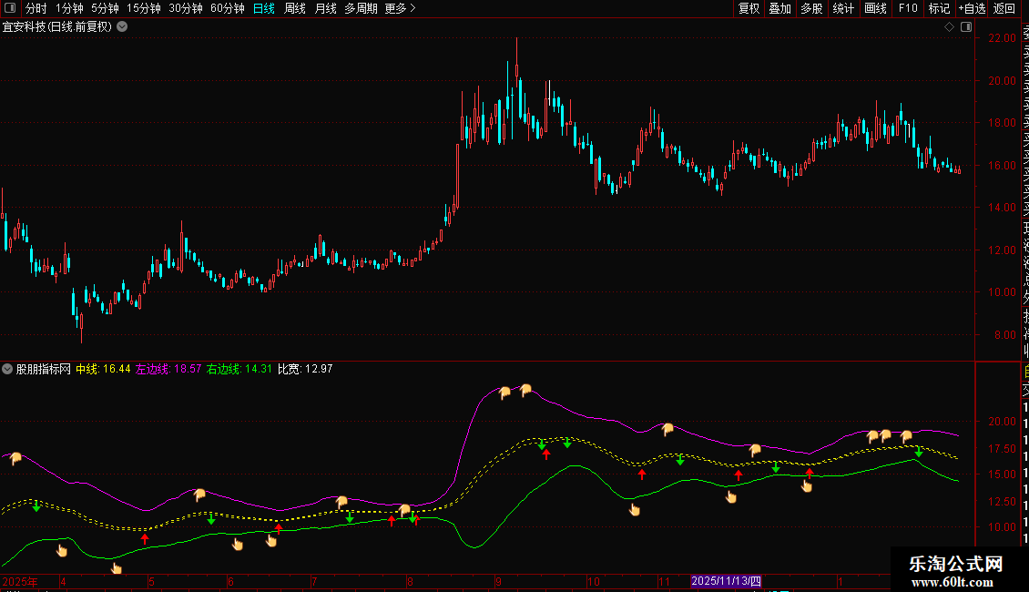 1. 指标性质:这是一个带有时间限制的通道类指标,包含中线、上轨(左边线)、下轨(右边线)以及买卖点信号。