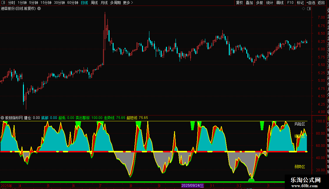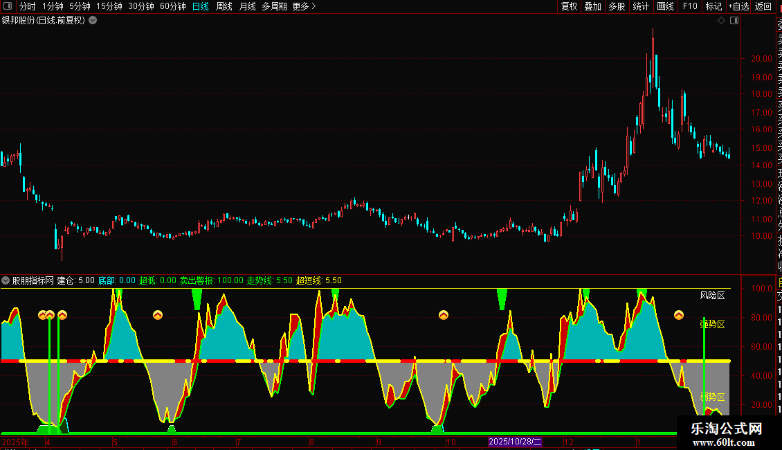 “强势区/弱势区”色带(NOTEXT1/NOTEXT2)与价格走势结合,可判断当前趋势是否有量价支持。