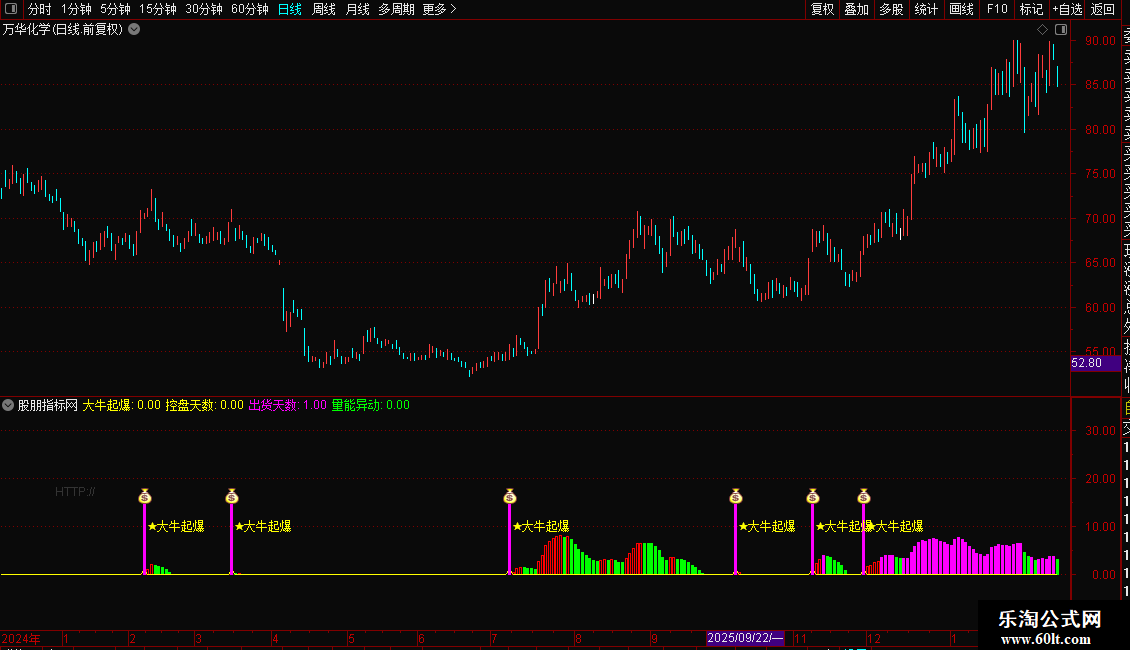 2. 起爆信号提示:当控盘指标上穿0轴(主力开始介入)且MACD处于做多区间时,会触发“★大牛起爆”黄色文字信号,同时伴随品红色柱体及对应图标,为进场提供明确指引;