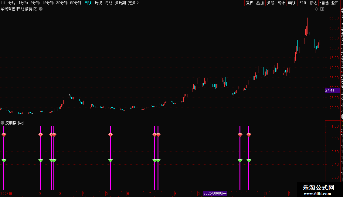 将公式加载到个股K线副图,当出现**紫色柱体+双钻石图标**时,为明确买入信号,信号同步匹配结果,可直观验证个股量价与指标共振有效性。