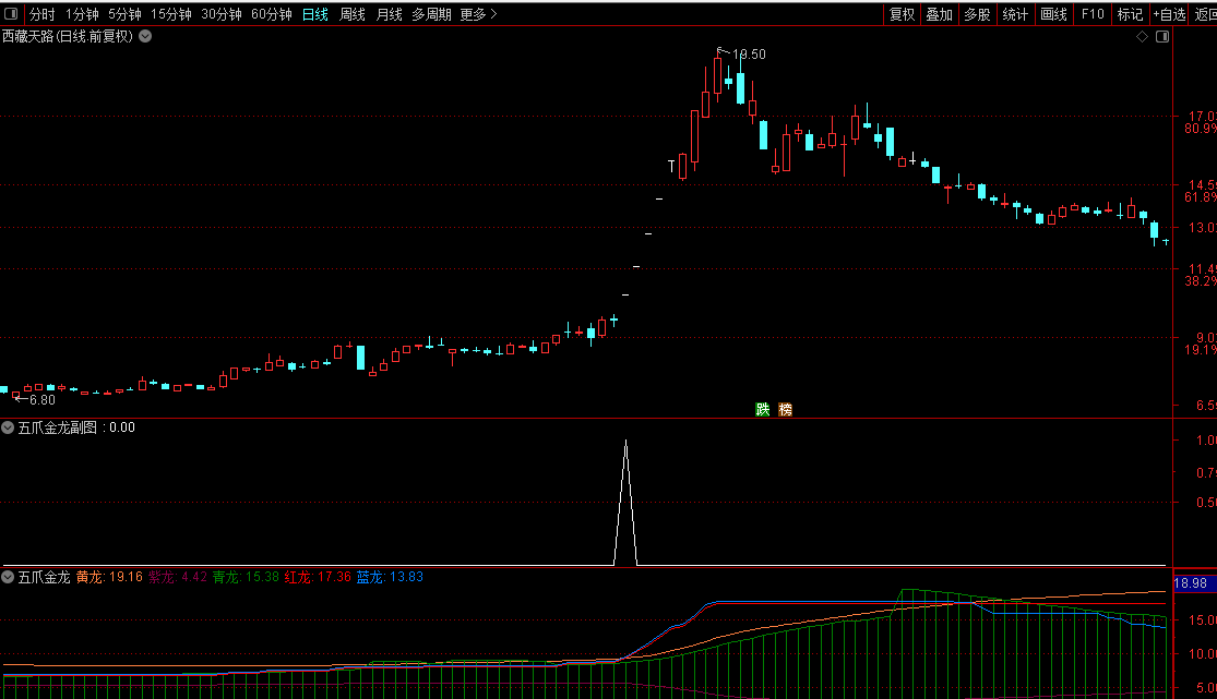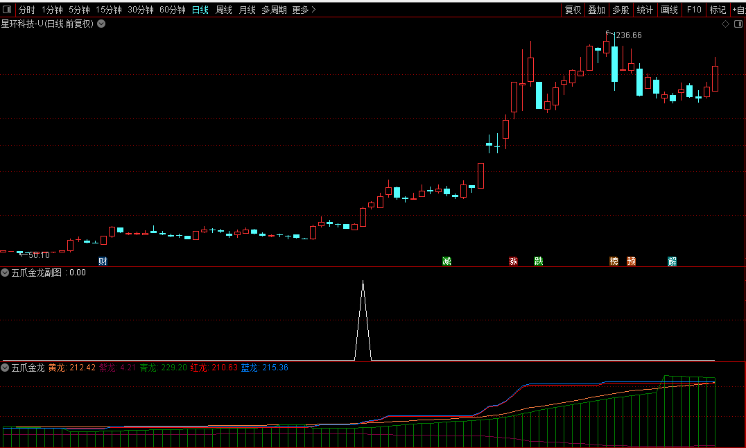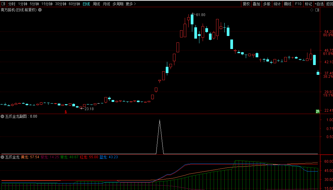 五爪金龙指标,专抓起爆点公式。用法简介:红蓝两爪从青龙身体探出,直至上穿黄抓,同时黄紫两抓上下张开喇叭口,就是起爆点。