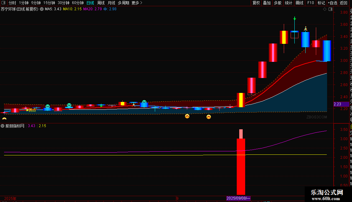 STICKLINE(C<=REF(C,1),股朋网,乐淘,3.05,0),COLORBLUE;