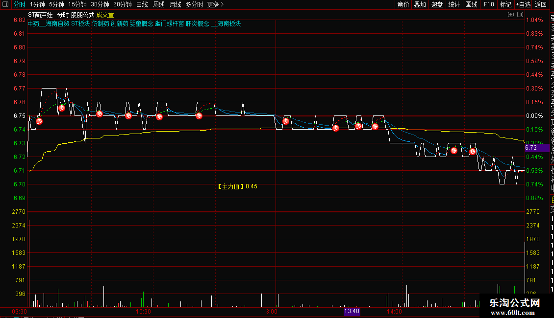 分时一致追涨主图是一款适配通达信的分时操盘工具,核心围绕量价、均线、主力资金等维度,精准捕捉分时阶段的追涨机会。公式自动适配ST股、不同市场板块(如创业板、科创板)的涨跌幅规则,实时计算涨停/跌停价、主力资金偏离值(主力值),通过EMA7(7分钟均线)、EMA26(26分钟均线)构建支撑与突破体系,同时结合MACD、量比、主力/大户/散户资金线等指标,识别“主力来了”“捉牛”等关键信号。