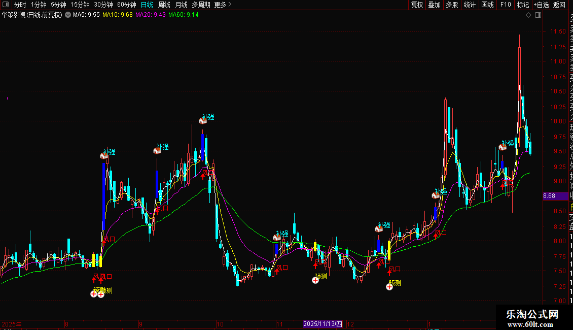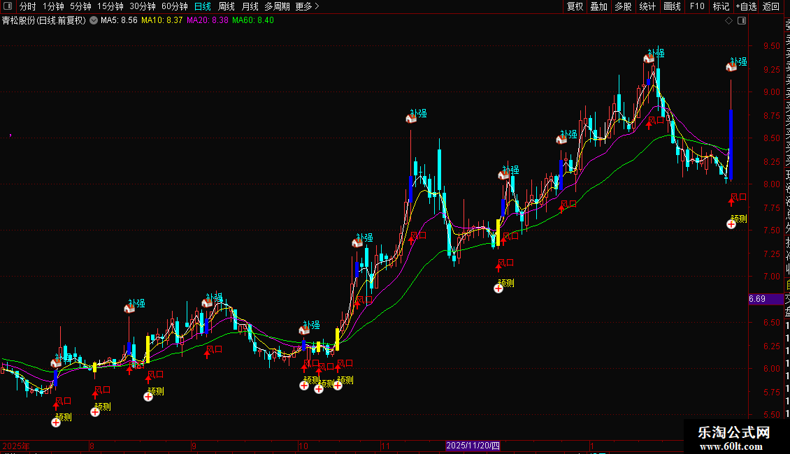 第一,风口补强指标融合了两种核心信号机制。其一为预测型信号,通过识别股价短期快速突破多重均线压制,并同步伴随均线系统向上拐头的形态,提前预判趋势转强。其二为补强确认信号,该信号综合评估均线上升角度、价格动量变化以及中期趋势方向,当三者形成共振时,发出明确的趋势补强确认,提升信号可靠性。