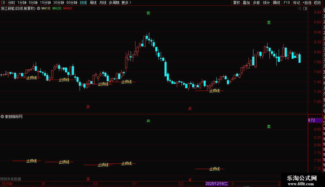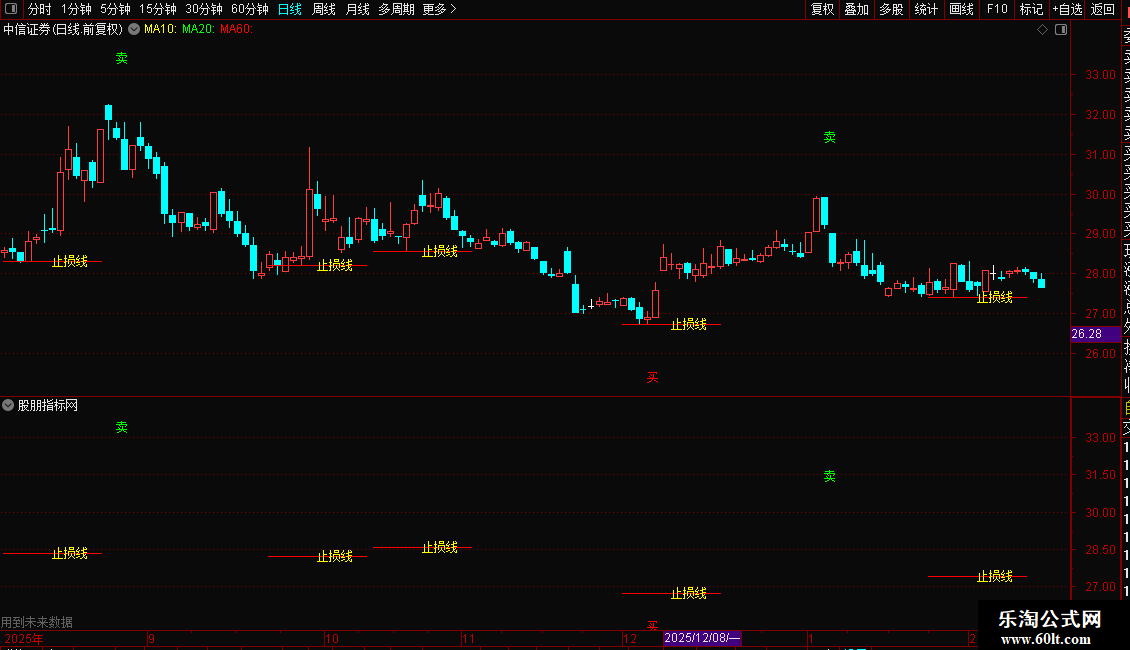 - 当AF成立时,在最近4日最低价位置绘制红色柱状线(高度50,线宽3倍),并标记黄色文字“止损线”。