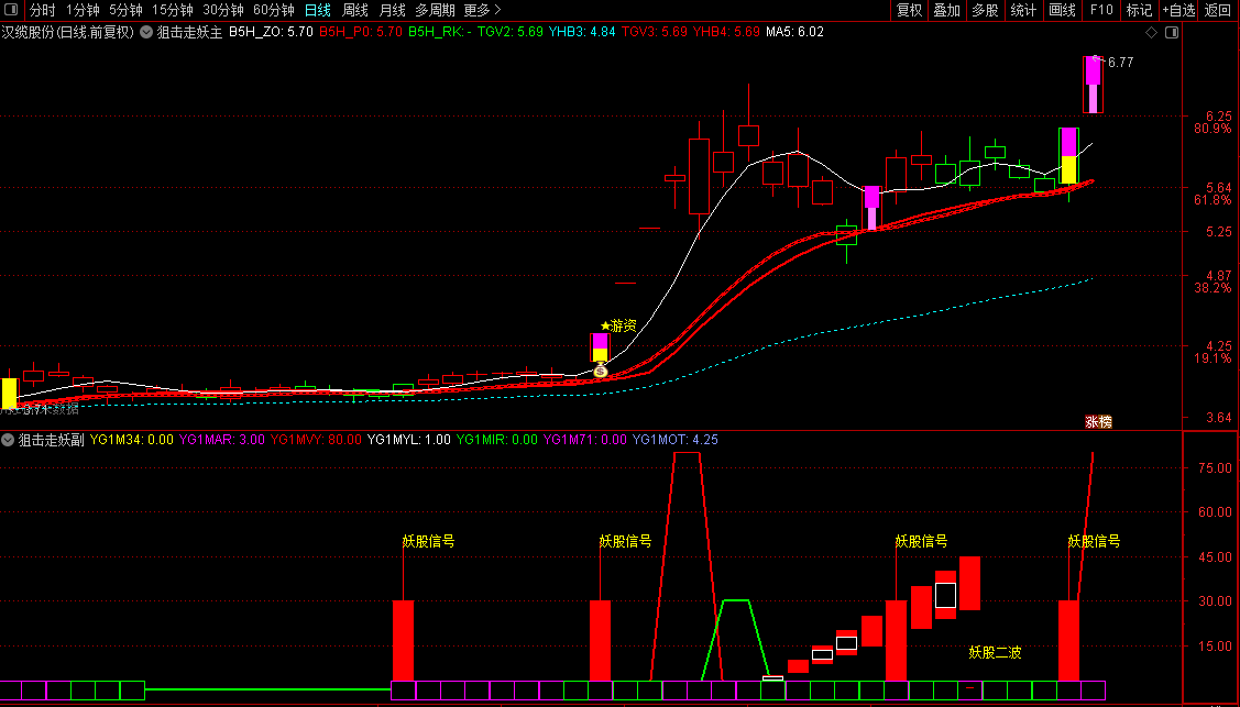 妖股二波识别: 副图还能通过特定K线组合,识别主力洗盘后启动第二波主升浪的“妖股二波”机会。