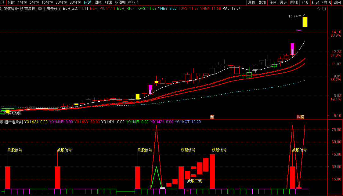 上穿50线(启动信号): 当MJN线从下方上穿50时,若满足特定条件,副图会发出红色“妖股信号”立柱,提示个股开始具备走妖潜力。