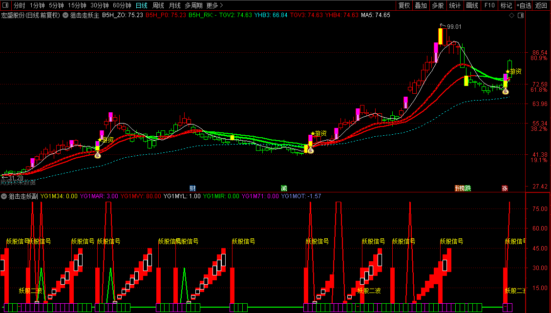 副图指标通过计算多条均线的角度平均值,生成了“妖股综合线”(MJN),用于判断个股的“妖股”潜力和风险。