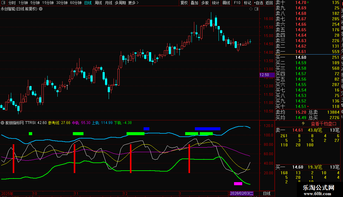 这是一个基于RSI原理的多维动量指标,名为TTRSI。它综合了收盘价、最高价、最低价、开盘价相对于其短期均线的强度,并加入了与大盘指数的关联度分析。