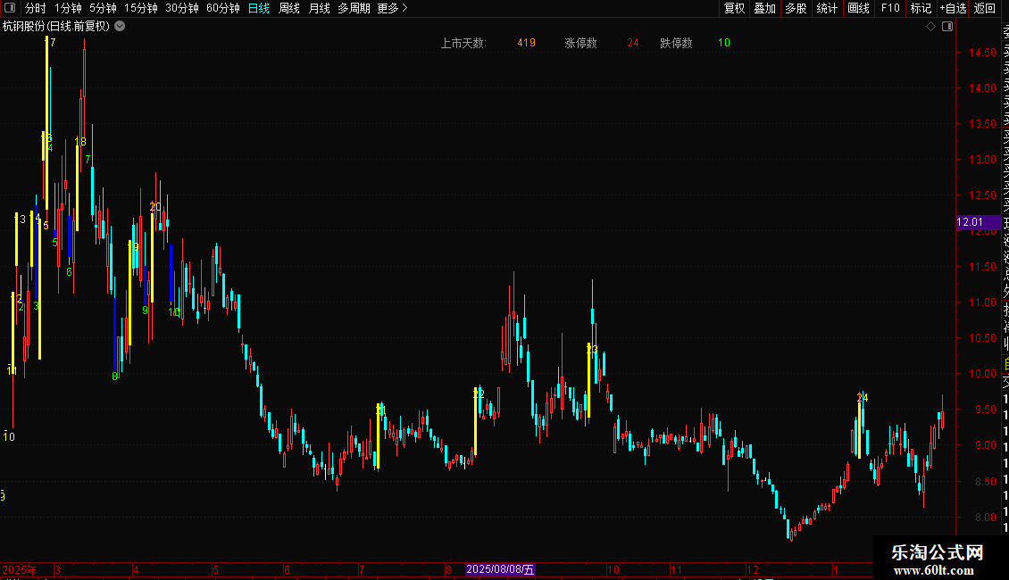 加载指标后,图表上会以青色柱线标记涨停日,以红色柱线标记跌停日。图表左上角区域会实时显示该股上市以来的交易天数、历史涨停总次数和跌停总次数。同时,在每根涨停或跌停K线的相应价格位置,也会标注出截至当日的累计次数。