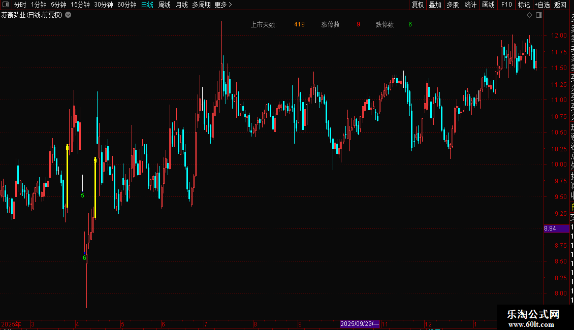 3. 在K线图左上角固定位置显示“上市天数”、“涨停数”和“跌停数”的统计结果。