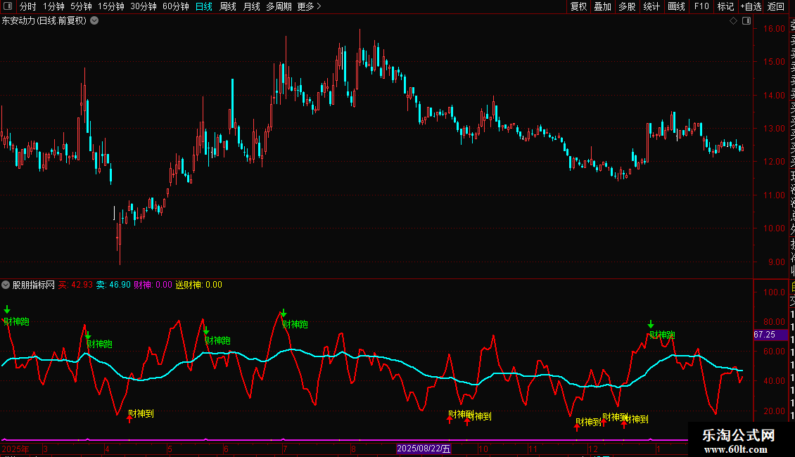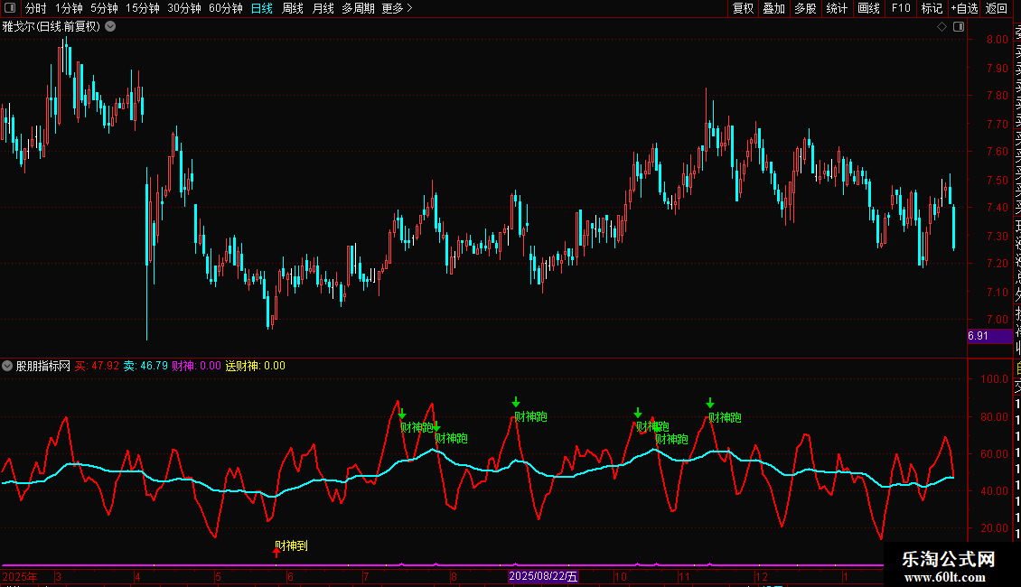 指标基于RSI与KDJ原理构建,包含两条信号线(买、卖)和两个财神信号(财神跑、财神到)。