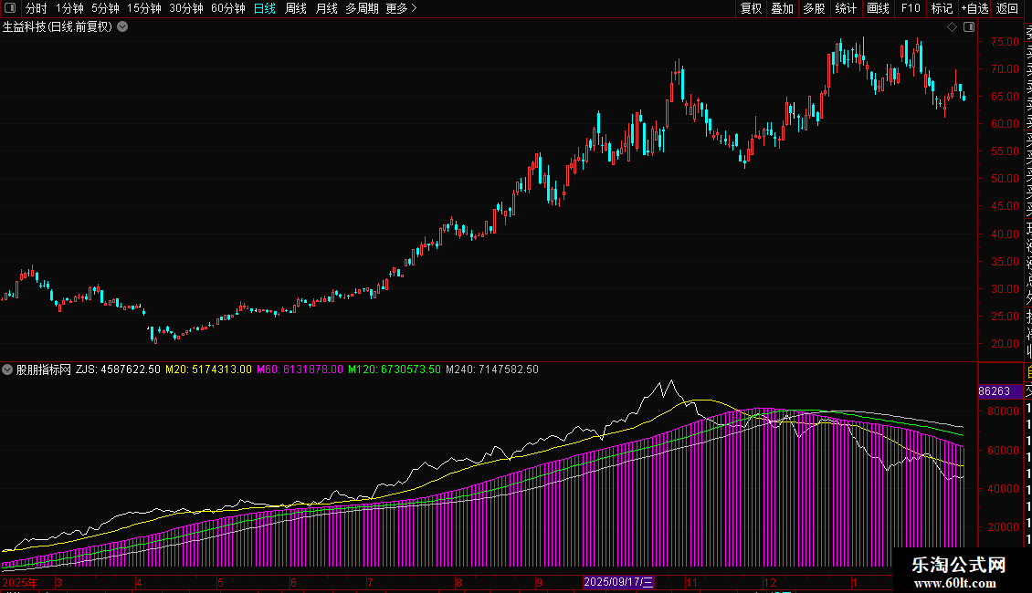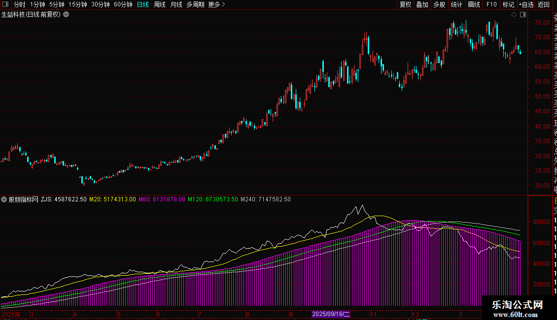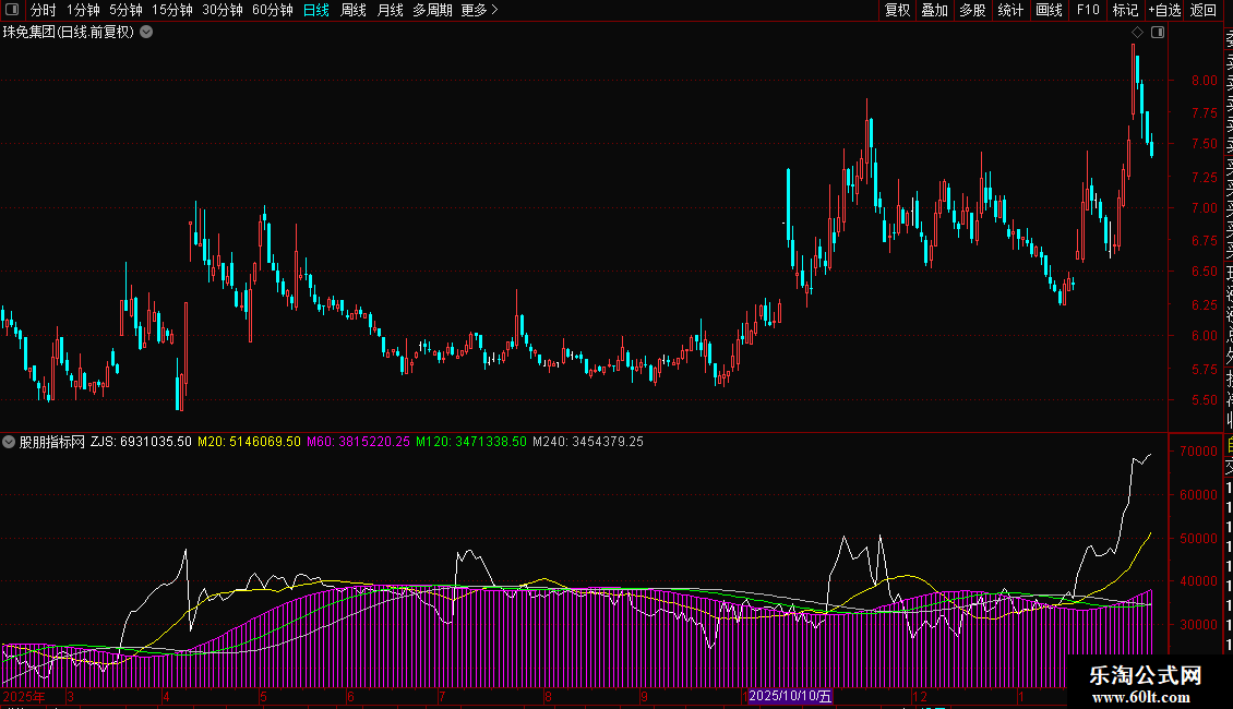 指标通过计算日内分时数据,分析资金流向。核心是“主净入”,由主买与主卖差值求得,代表资金净流入。ZJS为当日累计净流入值。后续均线(M20、M60、M120、M240)用于平滑ZJS,形成多周期趋势线,辅助判断资金流向的短期与长期态势。