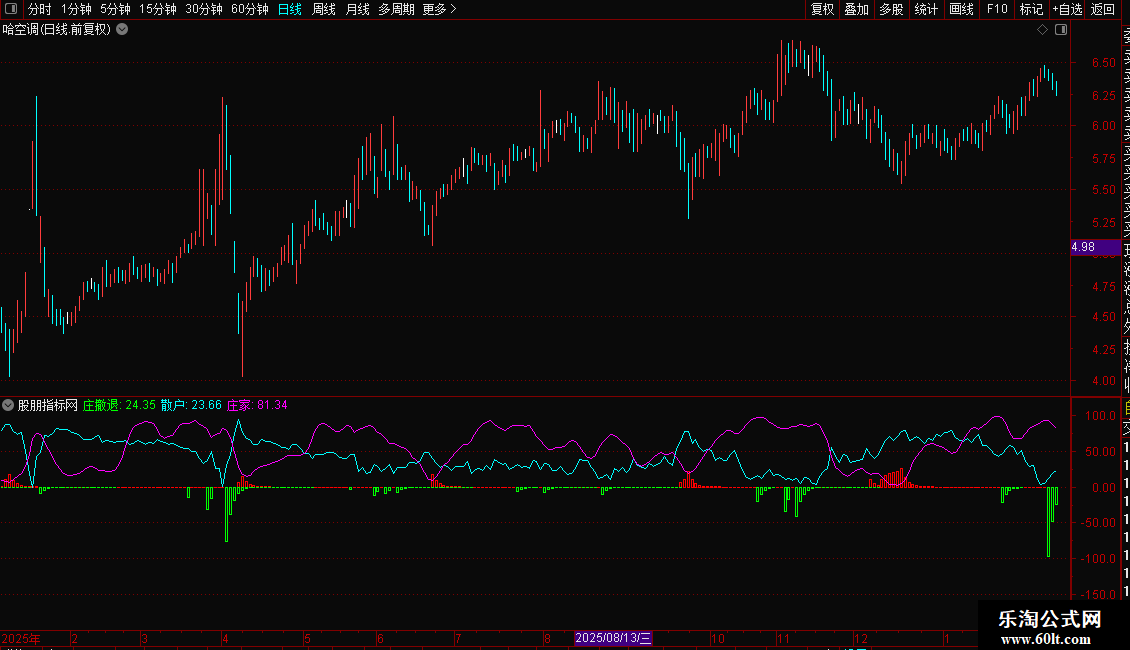 4. 庄家:紫线,代表主力资金动向,与散户线形成对比。