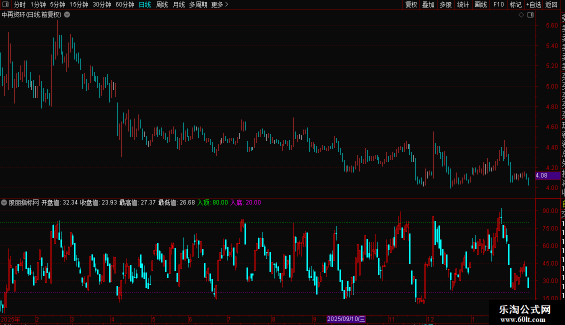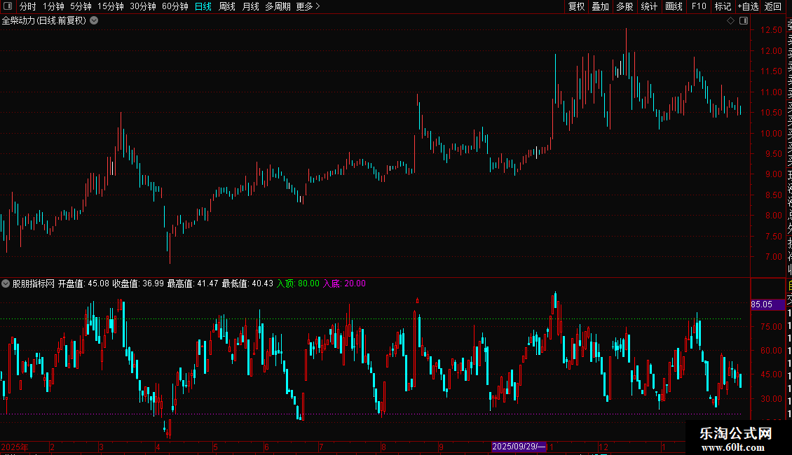 此外,指标包含一个综合信号(VAR13),该信号在满足特定条件时(如价格与成交量关系、短期相对位置超跌及价格动量极度疲软)会输出数值30。图表中还设置了80和20两条水平参考线,用于标识数值的潜在超买和超卖区域。