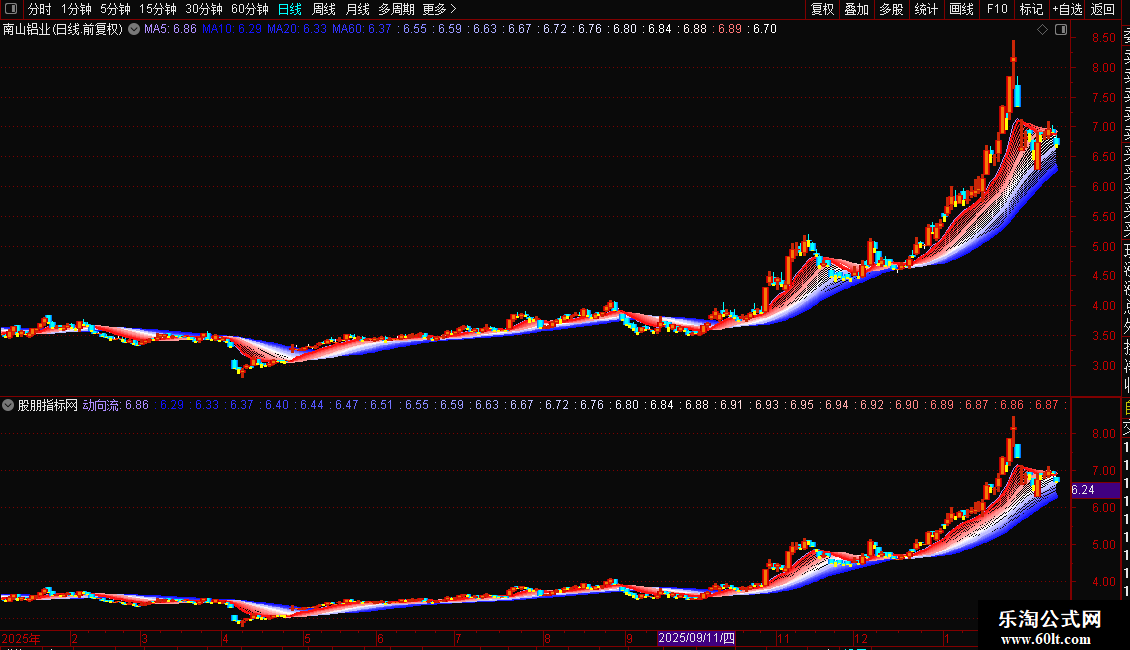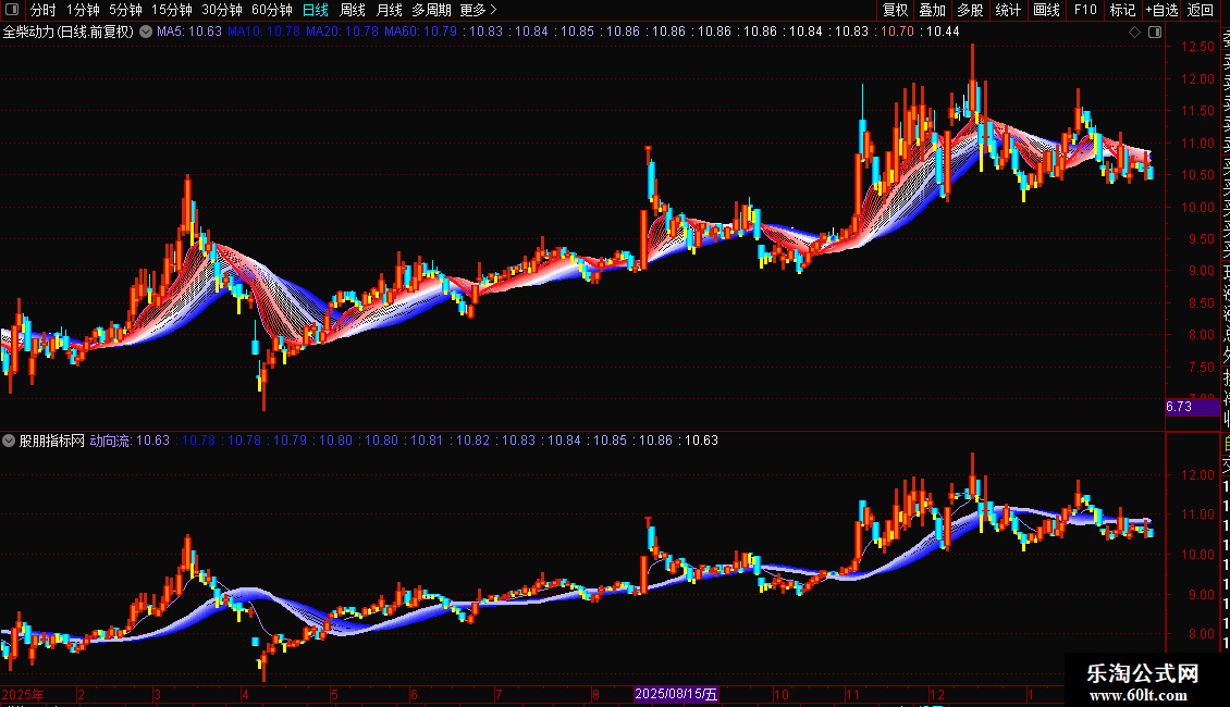 2. 绘制多层均线带:以“动向流”为基础,计算并绘制从2日到30日共29条移动平均线,形成一条由密到疏、颜色渐变的均线带,用于直观展示短期到中期的价格支撑与压力层次。