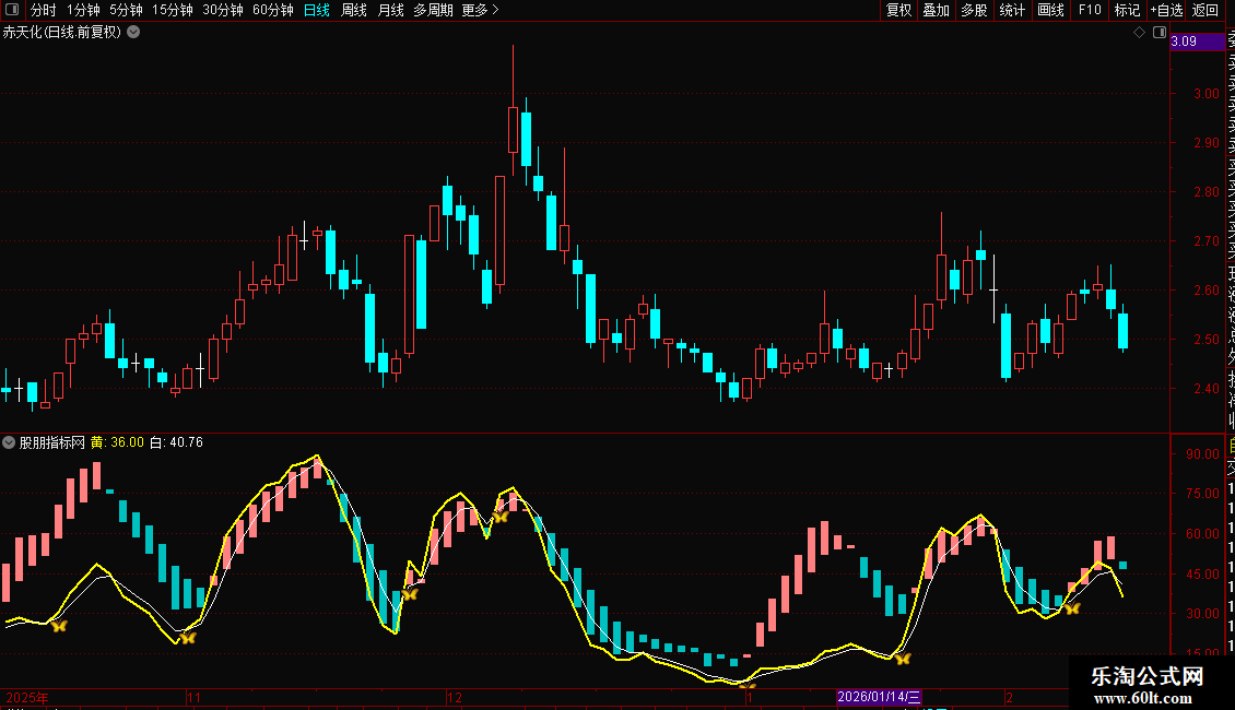 1. 计算KDJ指标,通过红蓝柱状线直观显示K线与D线的金叉死叉。