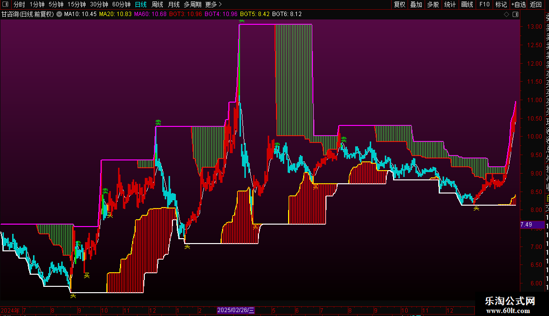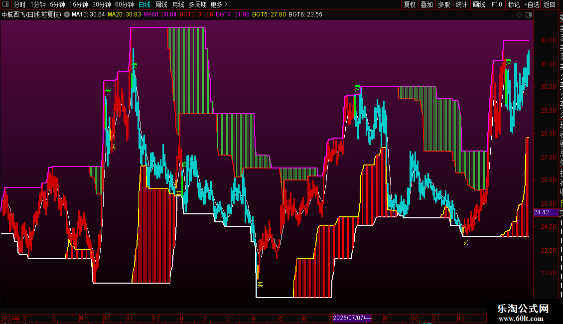 3. 支撑压力:红色BGT3(30日高点)、洋红BGT4(60日高点)为压力位;黄色BGT5(30日低点)、白色BGT6(60日低点)为支撑位,BGT5上穿BGT6时红线加粗,提示支撑走强。