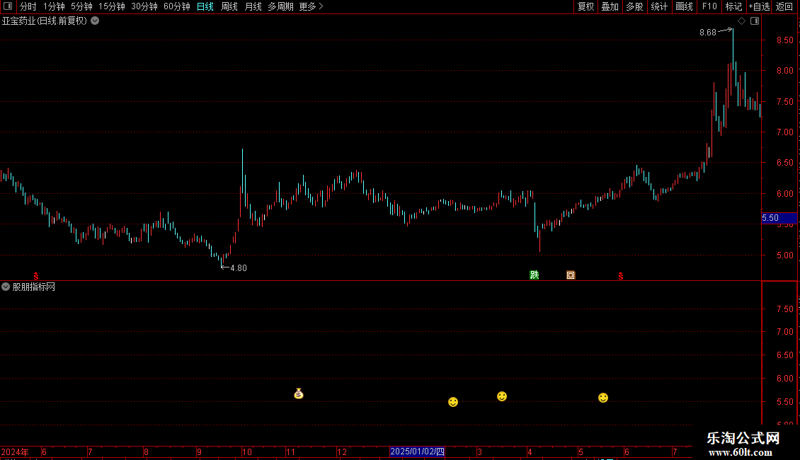 2. 第二波信号(VV4): 当35日和70日均线均已站在170日线上方,且35日线上穿70日线时,在K线下方标记笑脸图标。这通常代表强势趋势中的短期加速信号。
