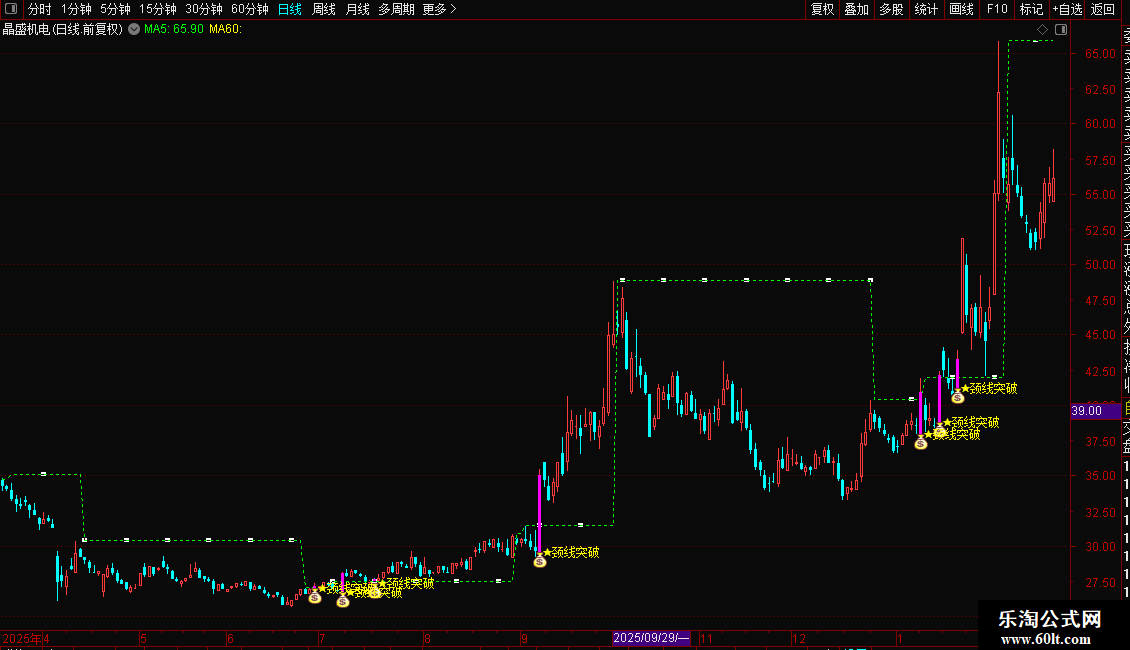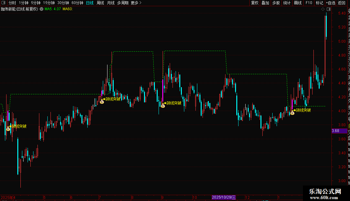DRAWTEXT(IF(VAR1>VAR14,IF(REF(VAR9< VAR14,1),1,0),0),L,' ★颈线突破'),COLORYELLOW;