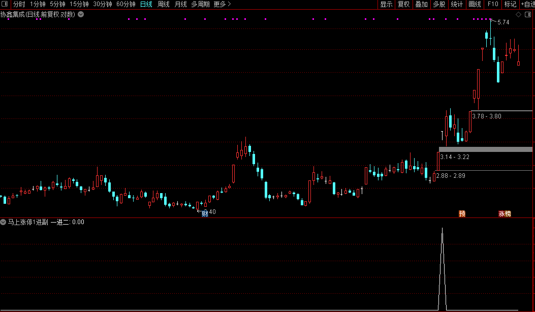 当公式发出“一进二”信号时,表示该个股在首板后,量价关系与技术指标等方面已达到晋级二板的核心条件。此时可结合盘面走势、板块热度等因素,进一步分析合适的介入时机。