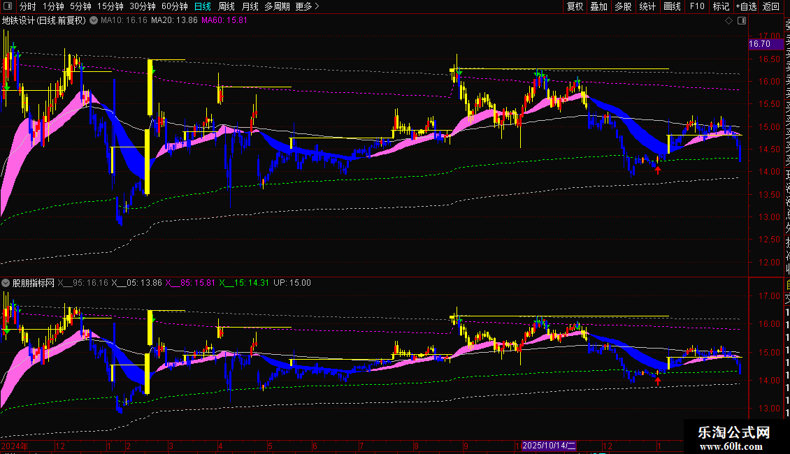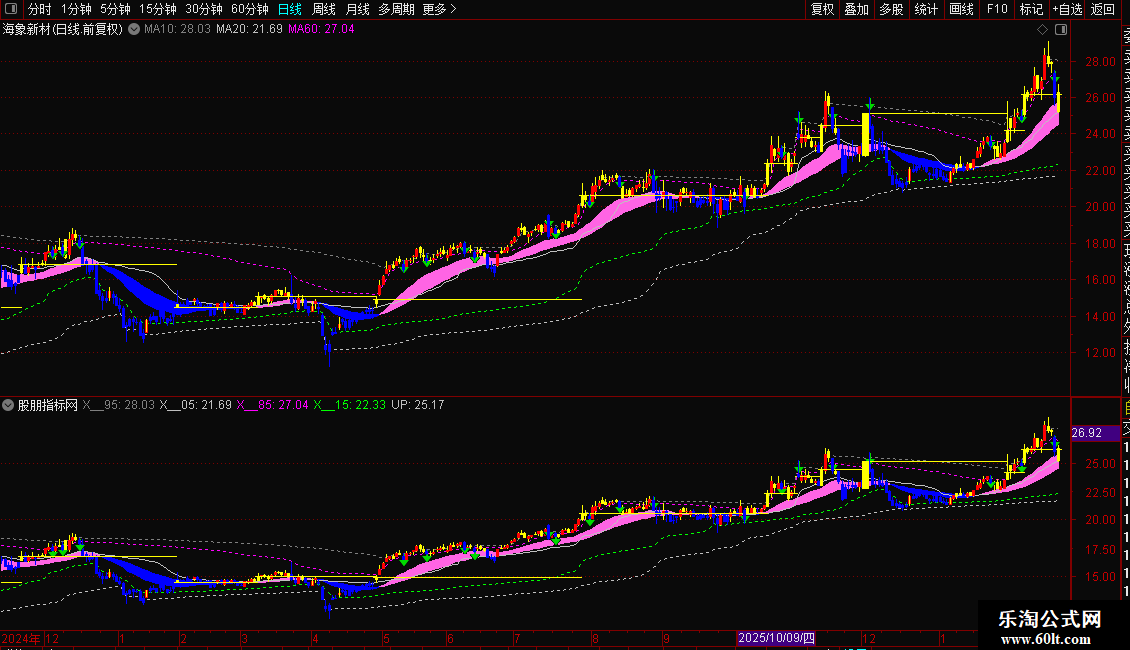 3️⃣ 趋势确认:主升浪双均线(MEMA+EMA)彩色带直观显示趋势强度,配合“有效突破”与“趋势破位”图标信号,实现多空转折预警。