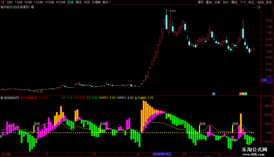 6. 主力启动信号:通过VARR1(一个快速摆动指标)上穿阈值线VARR2来提示短期资金进场或启动迹象,并标注“庄动”文字。