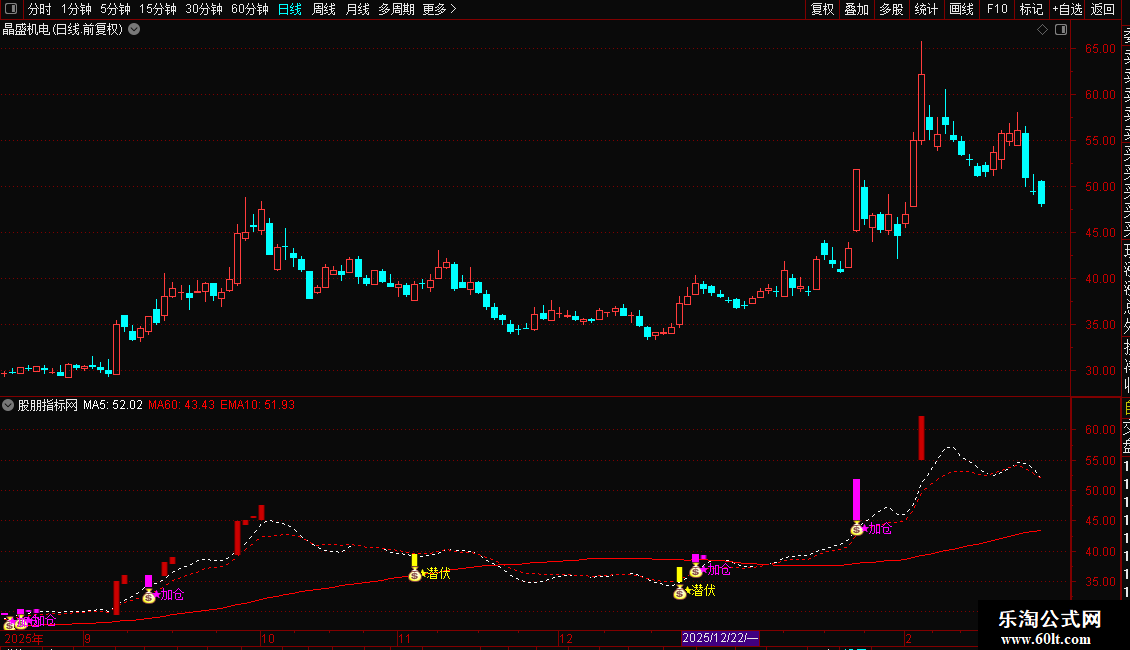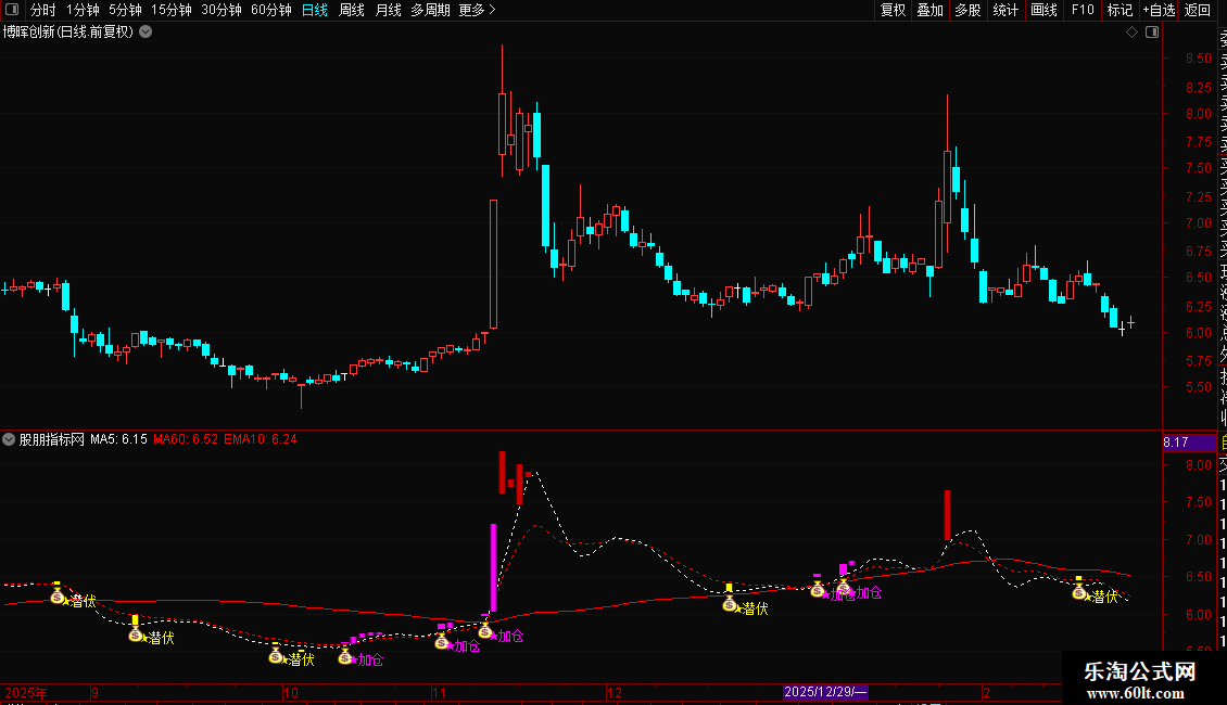 1. 主图公式加载后,5日虚线、60日蓝线为趋势参考,K线出现青色并标注“★潜伏”,且XGG27≤50时,是低位布局信号;