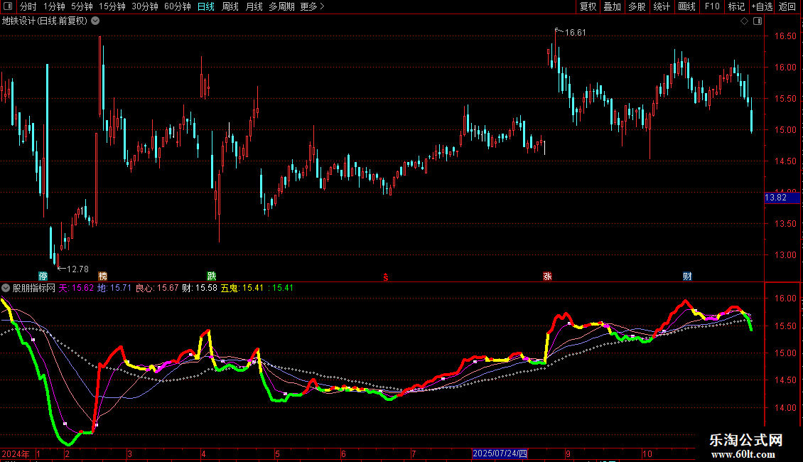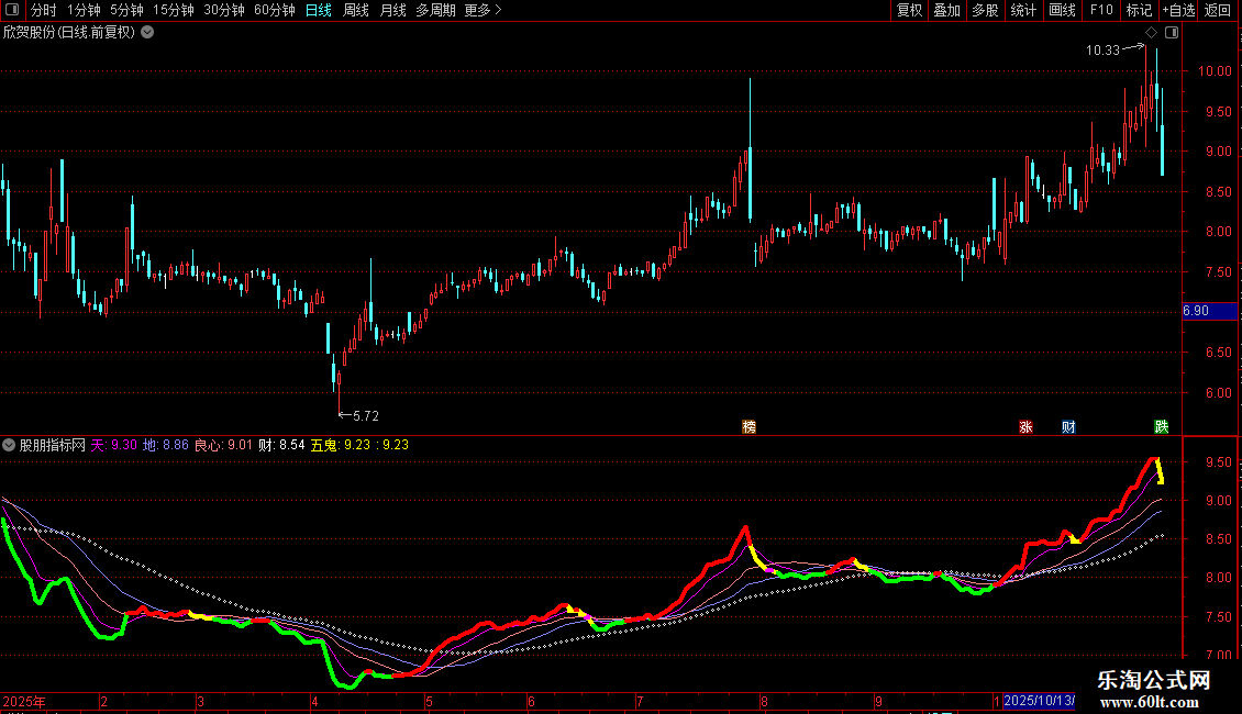 指标通过计算不同周期的移动平均线组合,构建了“天、地、良心、财、五鬼”五条核心均线。其核心逻辑是依据“五鬼”线相对于其他均线的位置关系,以及P1与P3两条复合均线的比较,来动态改变“五鬼”线的颜色和粗细,从而直观显示当前价格在不同层级均线系统中的强弱状态和趋势信号。