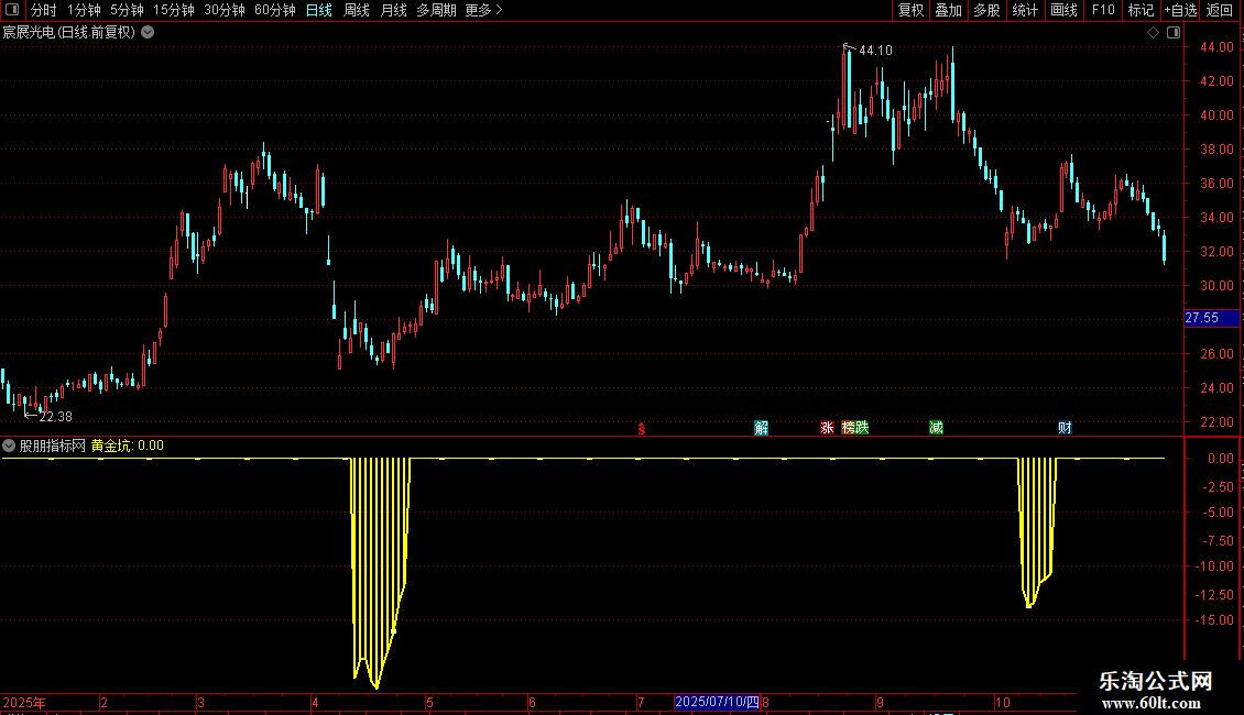当条件满足时,在副图以黄色粗柱线醒目地标记出“黄金坑”位置,其高度对应当时的偏离值。