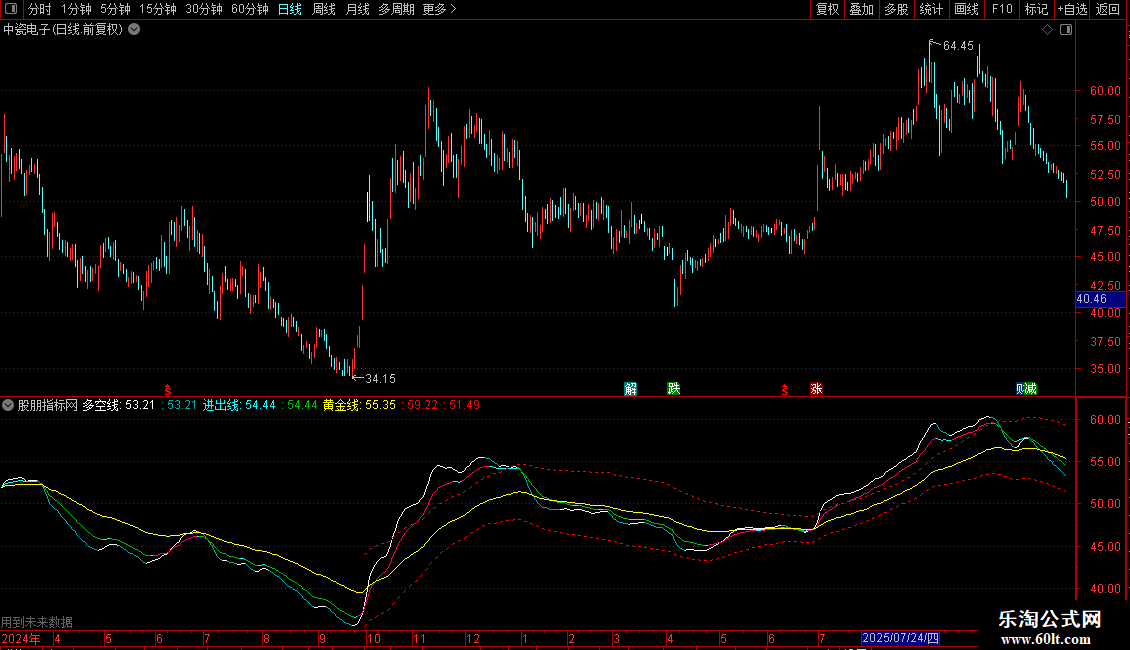 多空线和进出线通过特定算法计算,并依据其方向变化(连续5个周期向上或向下)来变色,直观显示短期多空状态和中期进出场信号。