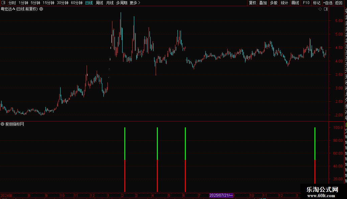 信号解读:当图表上出现红色和绿色的柱状线时,代表系统发出了一个潜在的买入信号。这表明该股在强势背景下完成了“先跌后涨”的形态转换,可能即将开启新一轮上涨。