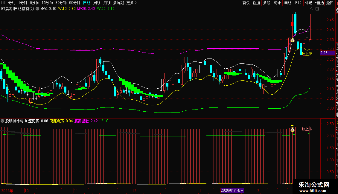 2. 副图指标:关注彩色柱体标注的见底次数,“六次见底”提示底部震荡,“八次九次见底”伴随“底部吸筹/即将拉升”文字,是关键加仓信号;