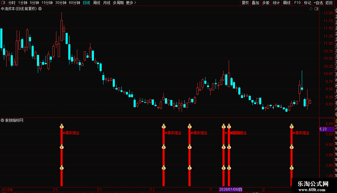 1. 副图公式:将源码导入通达信副图指标,当K线旁出现蓝色柱体+红色“★擒涨掘金”提示、配套笑脸图标时,代表短线上涨信号触发;