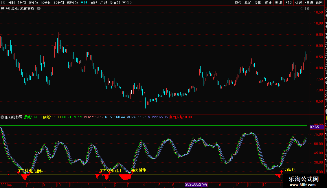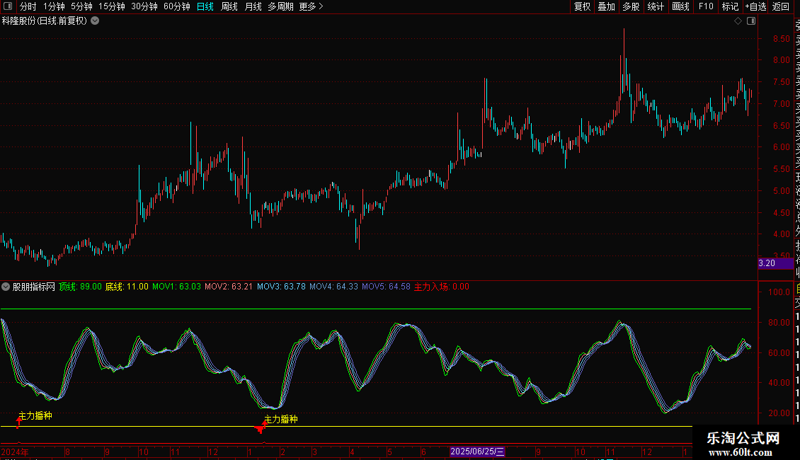 捕捉主力信号:当长期震荡指标从底部向上穿越阈值,同时价格处于特定支撑区间时,判定为主力资金可能入场的信号,并标记“主力播种”提示。