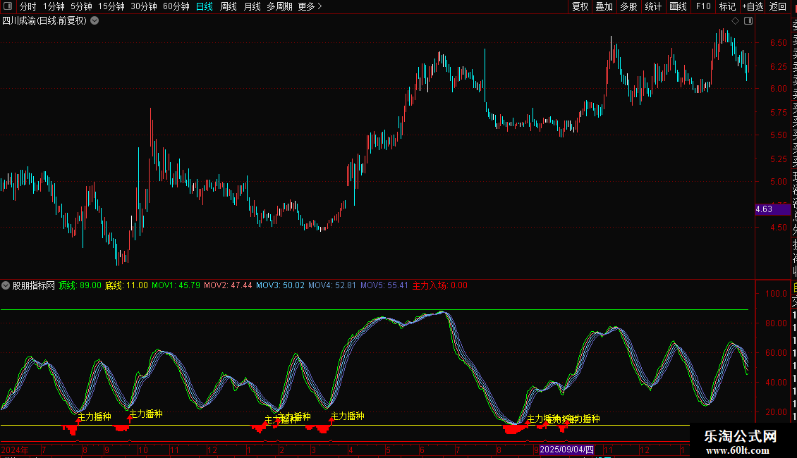 趋势强度监测:通过多条平滑移动平均线(MOV1至MOV5)的排列与走向,辅助判断市场短期趋势的强弱变化。