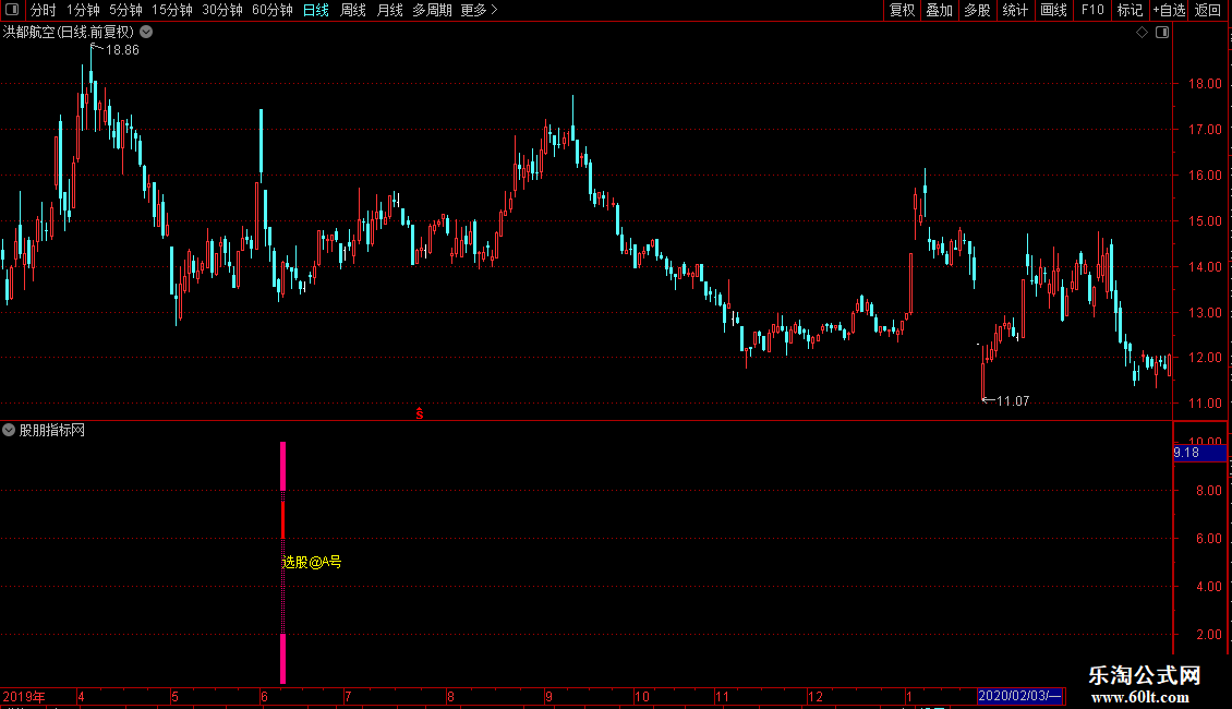 当所有条件满足时,会在副图区域绘制一组洋红色的柱状线和一个黄色的“选股@A号”文字标签,用以提示该买入信号。
