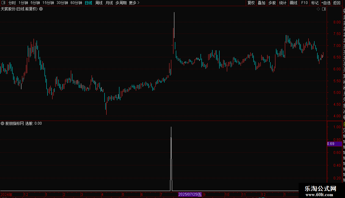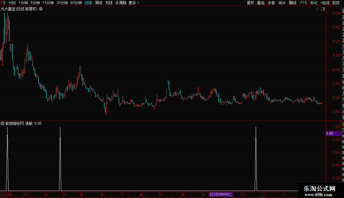 2. 加载后,指标会标记符合“选股”条件的信号点。