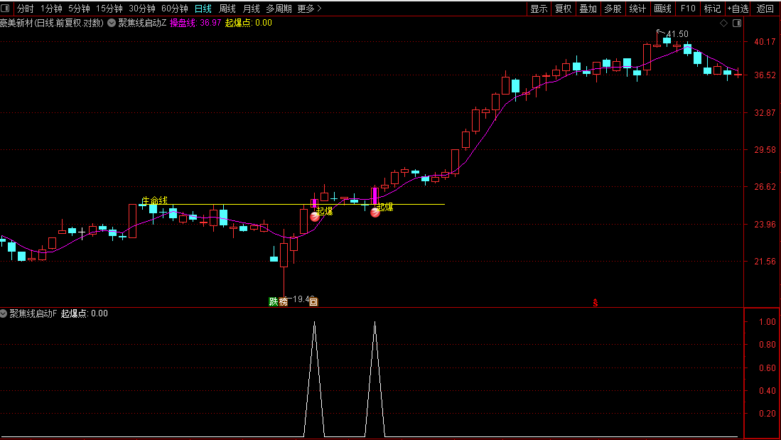 通达信【聚焦线启动】主副/选识别异常放量清晰展示股价短期趋势源码