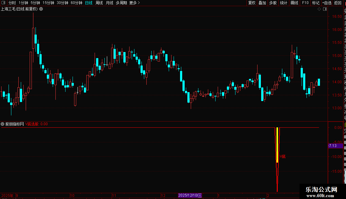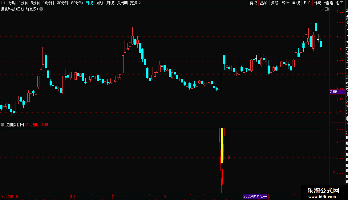 当指标在图表上出现“V底”文字及黄色柱状提示时,意味着可能的V型底部已经形成。这通常预示着下跌趋势结束,新的上涨趋势即将开始。投资者可将其作为中短线的买入参考信号,结合成交量等其他因素综合判断,以把握潜在的反弹或反转行情。