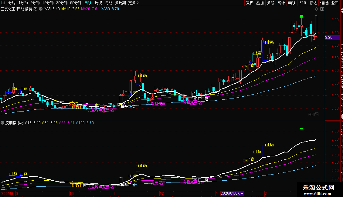 三、红衣侠女:放量上涨突破13EMA,3根K线内完成13EMA与55EMA黄金交叉;粉红文字+粗线画柱,短线动能爆发,配合分时买点快速跟进。